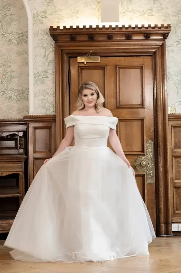 Fall in love with April, a romantic off-the-shoulder A-line gown by Millie May Bridal. With a beaded bodice and flowing tulle skirt.