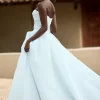 Moreover, this gown offers versatility through its detachable off-the-shoulder straps. Wear them during the ceremony for a soft, romantic touch, then remove them for a timeless strapless look that’s ideal for dancing and celebrating at your reception.