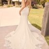 Fabric-covered buttons trail down the back, leading to a stunning laser-cut floral train. This intricate detail completes the gown’s look with a whimsical, nature-inspired finish that complements its bohemian aesthetic.
