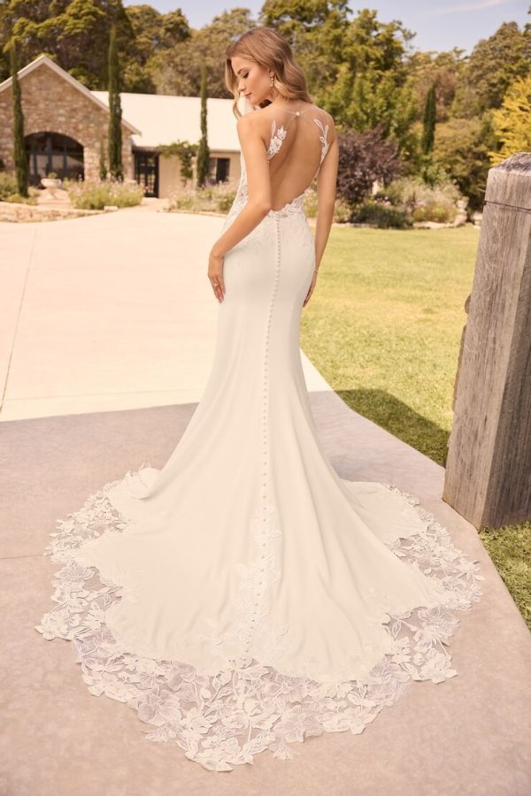 Coral’s high illusion lace neckline captivates your wedding guests from the moment you walk down the aisle. This sheer lace detail adds sophistication and delicate coverage while keeping the look fresh and modern. Intricate sequined lace appliqués decorate the semi-sheer bodice, catching the light beautifully to create subtle shimmer and rich texture.