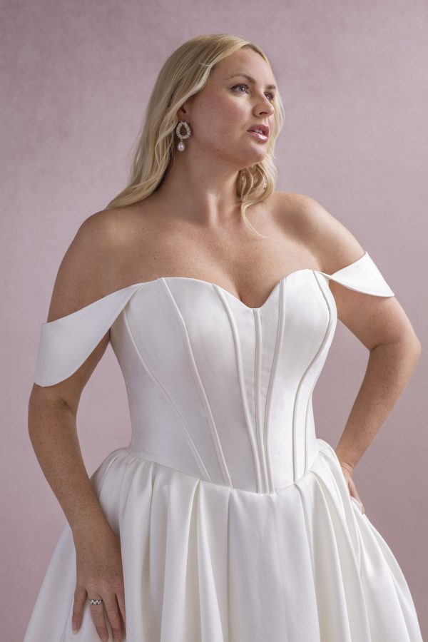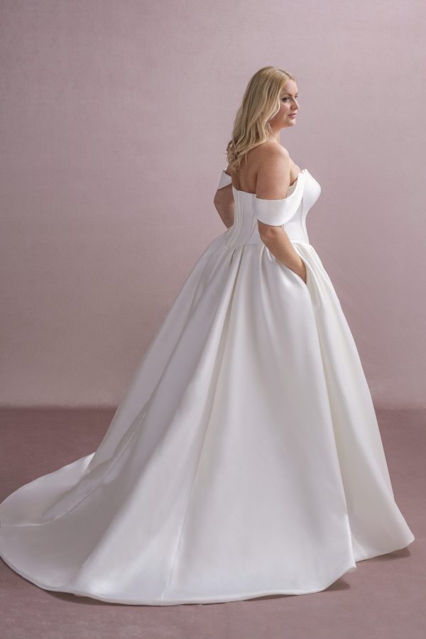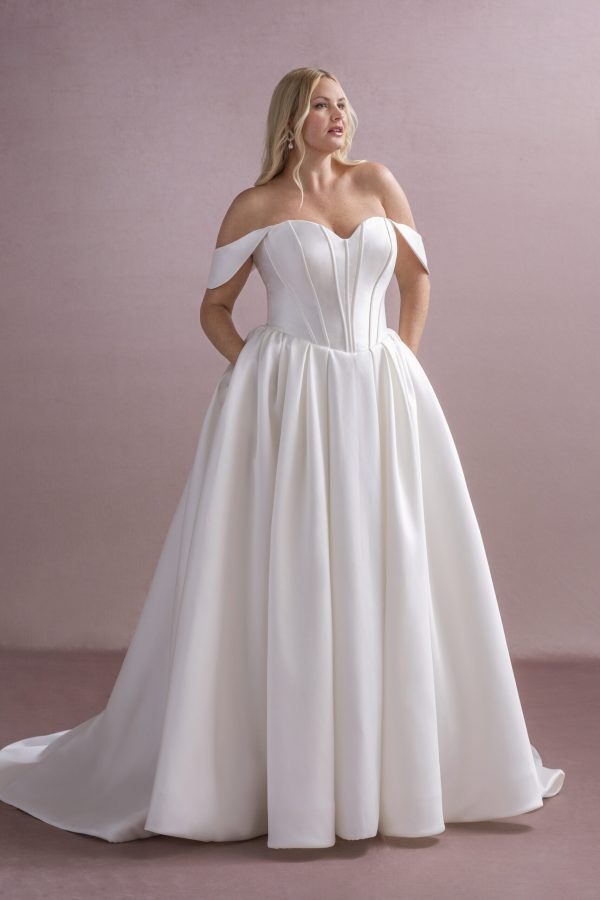 Dorothy MG208 is a Mikado ballgown with a boned bodice, detachable off-shoulder straps, and a soft pleated full skirt. A timeless look with modern elegance.