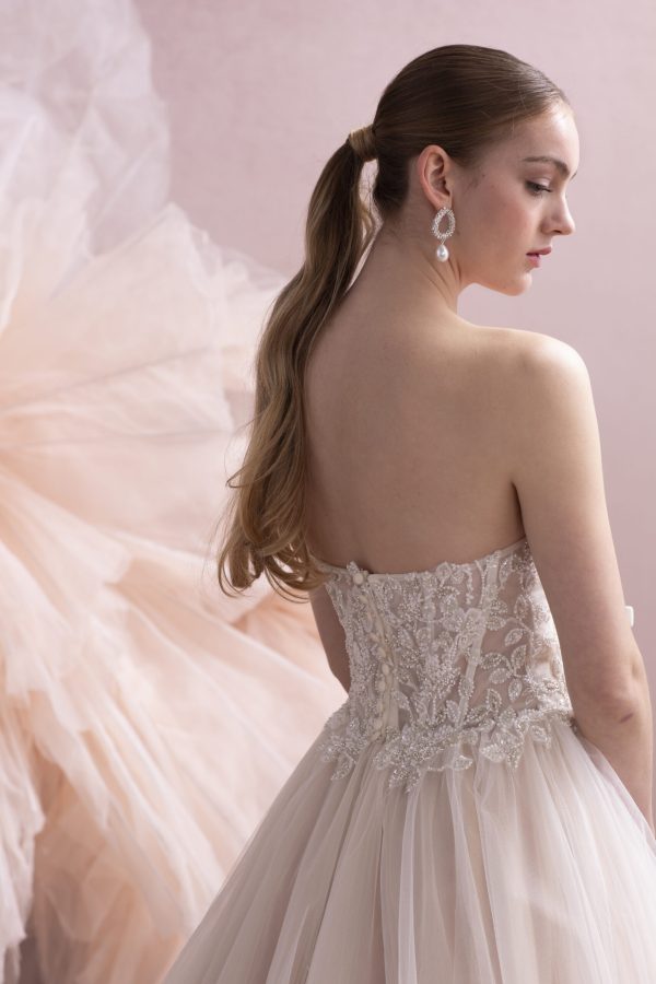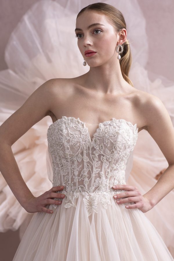 The Dottie MM251 is a romantic A-line wedding gown featuring a beaded channel-boned bodice, soft tulle skirt, and detachable straps—perfect for brides who want elegance with flexible styling.