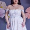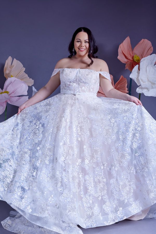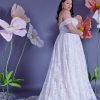 The Ella WSP048 from the White Studio Collection is a romantic A-line lace wedding dress featuring off-the-shoulder straps, a sweetheart neckline, and delicate silver thread embroidery with scattered beads on soft tulle.