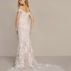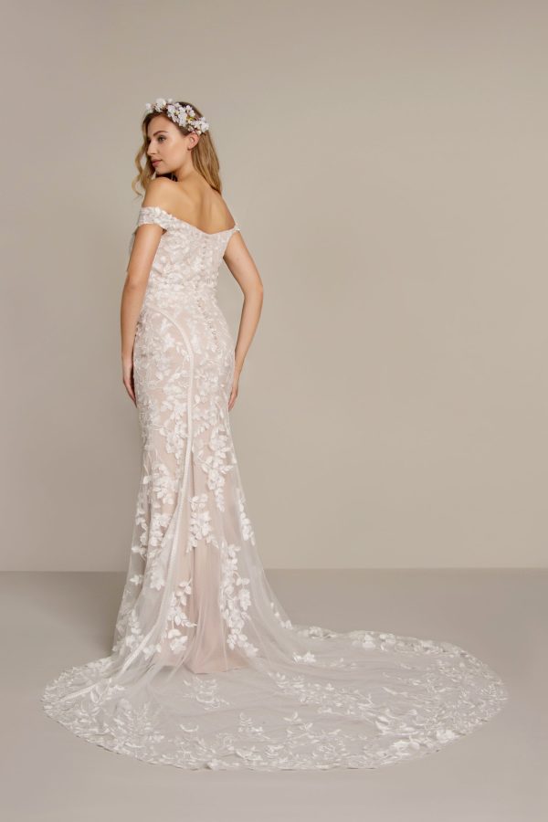Crafted from luxurious all-over lace, the dress hugs the body through the bodice and hips, creating a sleek and feminine shape. It then flares out dramatically at the knees into a structured fishtail skirt, delivering graceful movement and red-carpet-worthy flair. The detailed lace-trimmed train glides behind you with every step, adding depth, drama, and a truly bridal finish to your walk down the aisle.