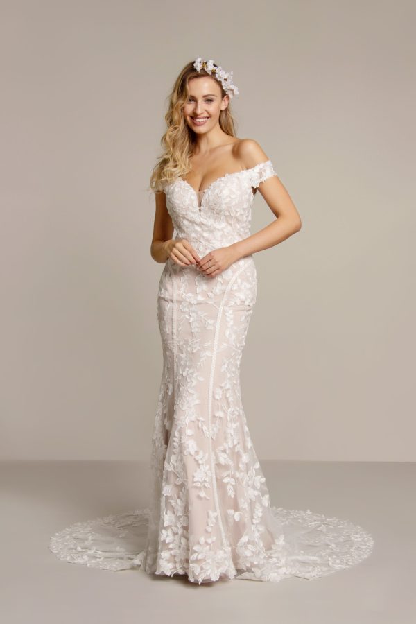 The Emily MM134 by Millie May is an all-over lace fishtail wedding gown with a sweeping lace train and zip-back closure. Elegant, romantic, and designed to flatter.
