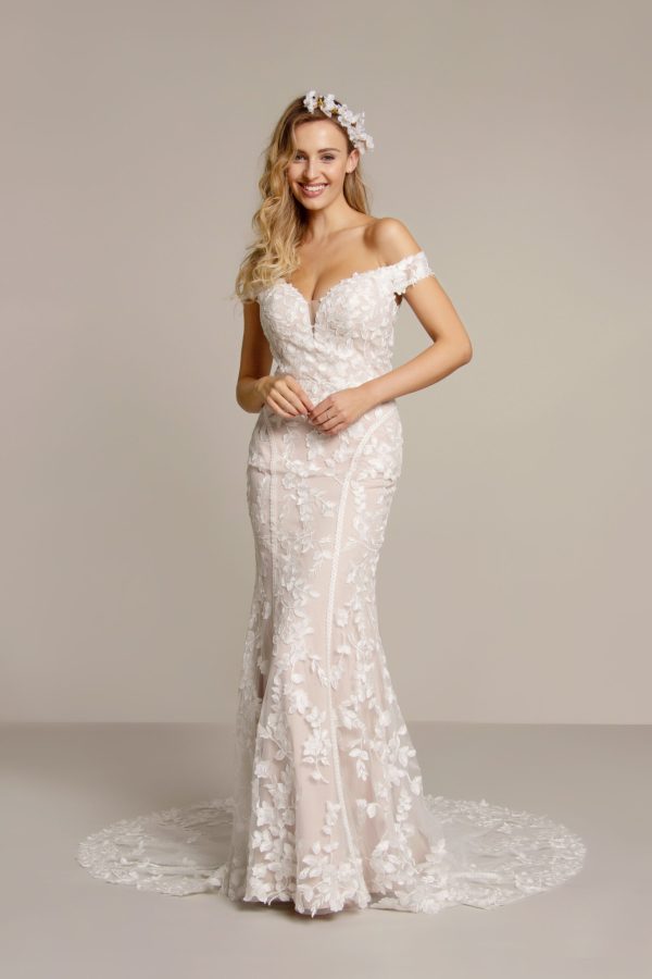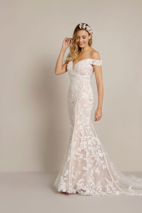 Fishtale gown all over lace with lace trail on skirt. Zip back.