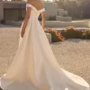 Starting with the bodice, Erika features an off-the-shoulder neckline paired with a soft sweetheart shape, beautifully framing the décolletage and shoulders. This romantic detail sets the stage for a truly regal look. Visible boning in the bodice adds structure and support, while beaded floral lace appliqués provide texture and sparkle, merging classic bridal charm with contemporary design.