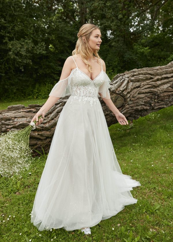 Wow so many dreamy features on this beautiful whimsical wedding gown. The striking illusion bodice, soft layers of glistening tulle and draped tulle sleeves will give you all the princess boho vibes. Button and zip fastening. Ivory/Almond Pink/Light Rumpink. Size 14