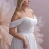 The delicately ruched bodice flatters the figure while adding elegant texture across the bust and waist. A sweetheart neckline gently enhances your silhouette, while off-the-shoulder chiffon straps provide a romantic, ethereal touch that perfectly balances modern design with timeless femininity.