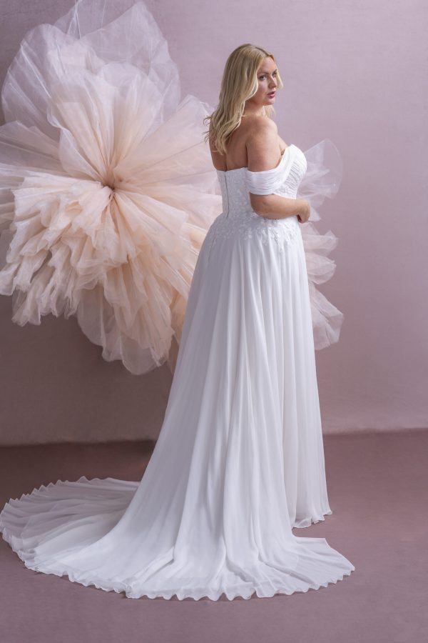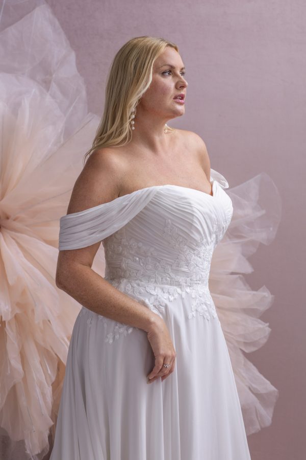 Graceful, romantic, and effortlessly flattering, the Florence MG209 from the Millie Grace Collection is a stunning choice for brides who value both softness and sophistication. This A-line gown is crafted in airy cotton chiffon, offering lightness and movement that flow beautifully with every step.