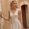 The Harper wedding dress by Madi Lane combines romantic botanical lace, sequin details, and soft tulle to create an enchanting A-line silhouette. With a plunging V-neckline and illusion straps, Harper offers timeless elegance and ethereal beauty for the modern bride.