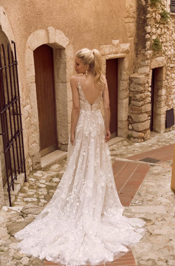 Harper’s plunging V-neckline, softened by a tulle inset, adds a touch of daring elegance while maintaining a refined look. The illusion tulle straps on both the front and back create a delicate, ethereal feel, adding to the gown’s romantic charm.