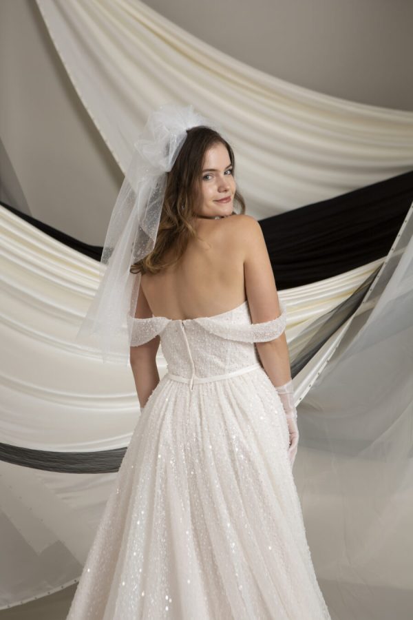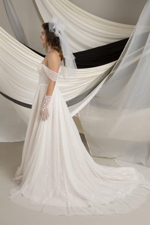 One of the standout features of the Hollie MM213 is its detachable beaded straps. These delicate straps add a touch of sparkle and glamour, and they give you the flexibility to transform your look effortlessly. Start your ceremony with the straps for a classic, refined appearance, then remove them for the reception to reveal a chic, strapless style that feels fresh and modern. This versatility ensures you can adapt your gown to match every moment of your wedding day.