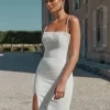 Jay features a straight neckline adorned with delicate embellishments that catch the light, adding a refined touch of glamour to the clean, minimalist design. The neckline’s simplicity balances beautifully with the subtle sparkle, creating a look that’s both chic and eye-catching.