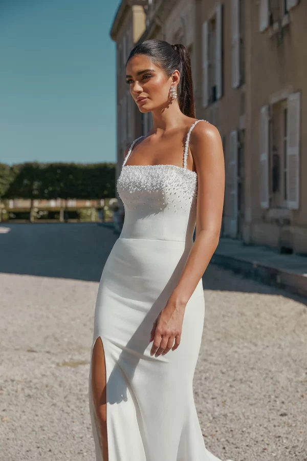 Jay features a straight neckline adorned with delicate embellishments that catch the light, adding a refined touch of glamour to the clean, minimalist design. The neckline’s simplicity balances beautifully with the subtle sparkle, creating a look that’s both chic and eye-catching.