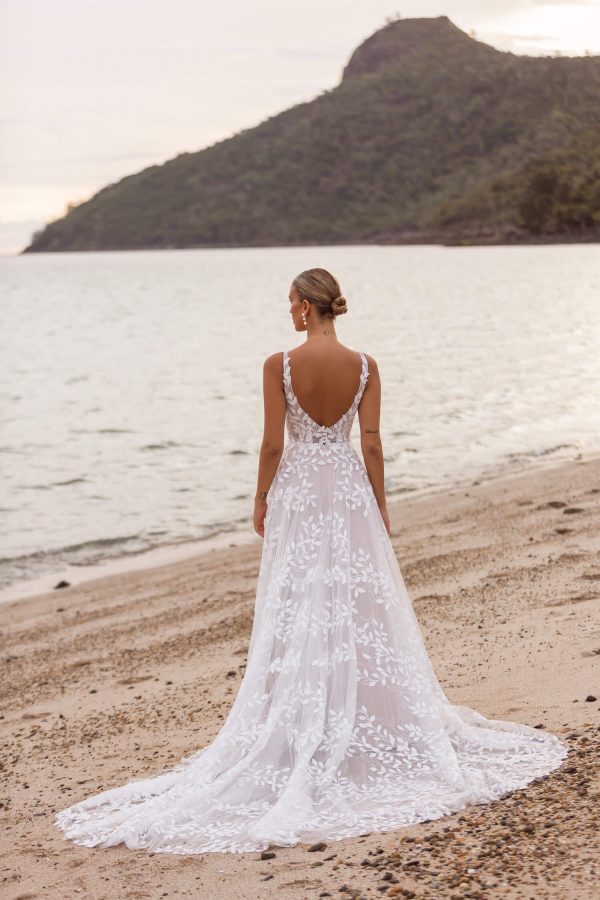 Romantic and effortlessly elegant, the Jaya wedding dress is everything a Madi Lane bride dreams of. Featuring a signature A-line silhouette and silky Charmeuse lining, she offers a luxurious yet lightweight feel. A plunging V-neck bodice and detachable tulle flutter straps add a whimsical touch, while leaf-like lace and delicate sequins bring a glittering finish.