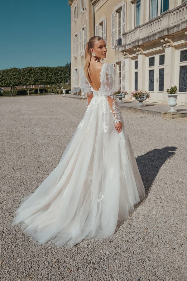 This gown combines bridal trends like Eye-Catching Details, Enchanting Details, Soft and Dreamy, and Graceful Classics. The bodice features delicate lace, shimmering sequins, and three-dimensional floral appliqués. Together, these elements create a romantic and sophisticated look.