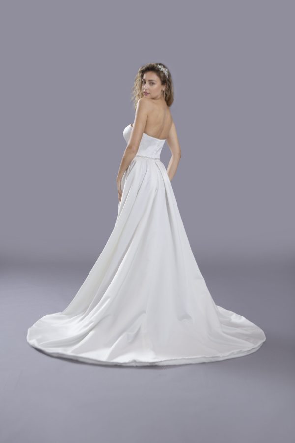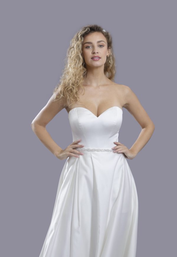 The Joanna MM187 by Millie May blends timeless romance with modern style. With a sweetheart neckline, sparkling beaded belt, flowing pleated skirt, and a chic side split with pockets, this gown is designed for confident, elegant brides.