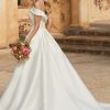 The fitted bodice showcases a flattering sweetheart neckline and gently folded off-the-shoulder straps, which beautifully frame the shoulders and add soft, romantic elegance. This structured bodice highlights the décolletage while offering a supportive and figure-enhancing fit.