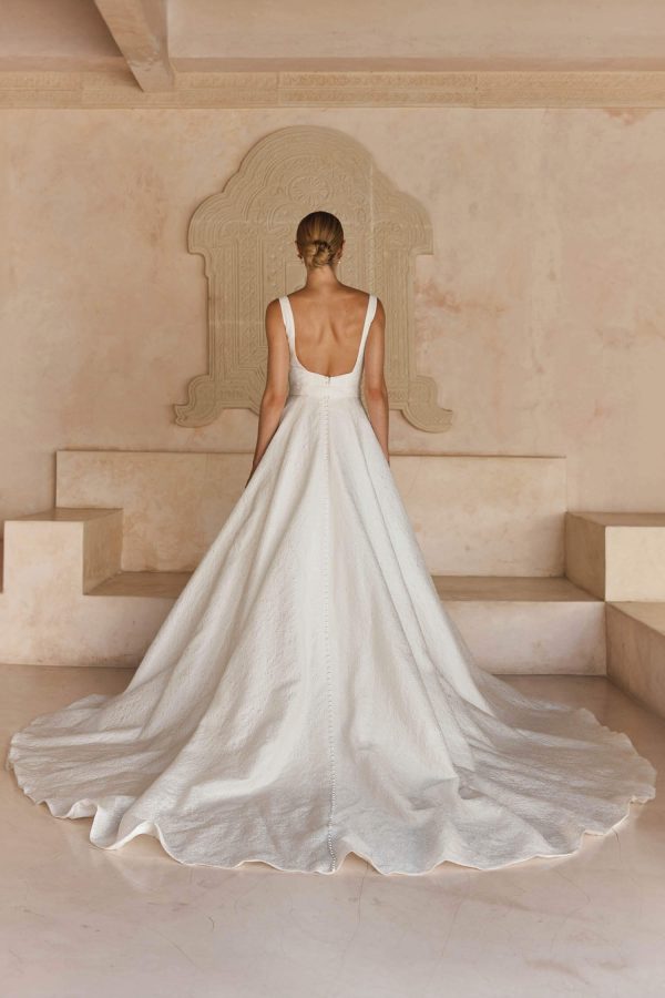 The back echoes the front with a square neckline, creating a balanced and cohesive design from every angle. Whether you choose Jacquard, Mikado, or Suede Satin, Laurie delivers timeless sophistication with modern appeal.
