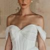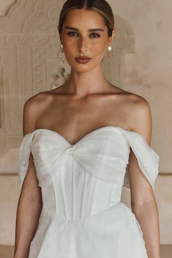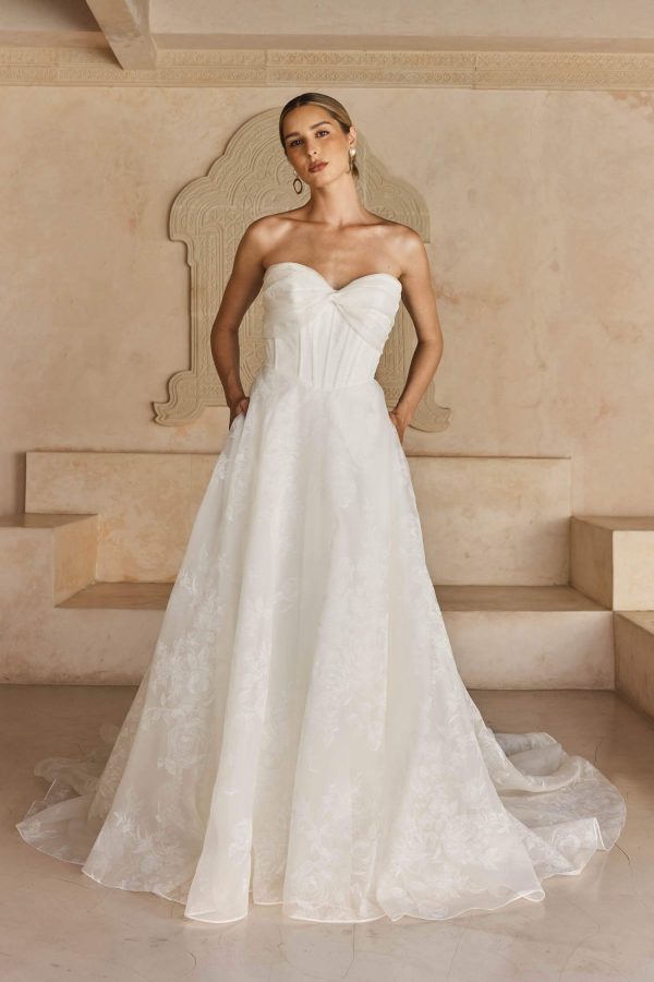 The Lawson Wedding Ballgown by Madi Lane offers modern elegance with floral organza, a strapless sweetheart bodice, Basque waistline, and detachable shoulder cuffs for a chic and romantic bridal look. Perfect for brides who want a clean, ethereal gown with a contemporary twist.