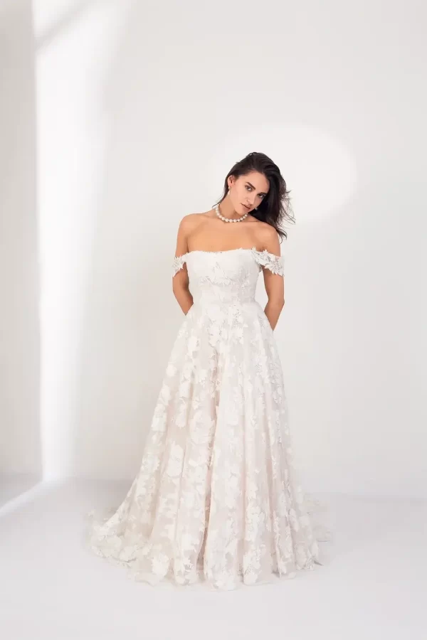 The gown features an exquisite lace bodice, adorned with delicate beading that adds subtle sparkle and texture. The off-shoulder neckline gently frames the shoulders and collarbone, creating a flattering and feminine shape that radiates confidence and charm.