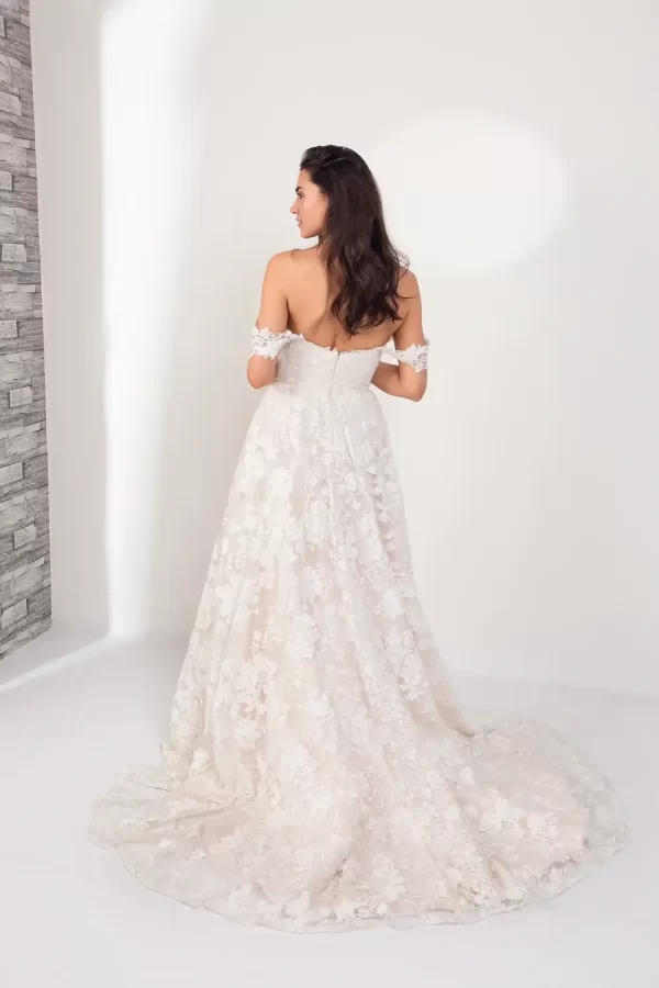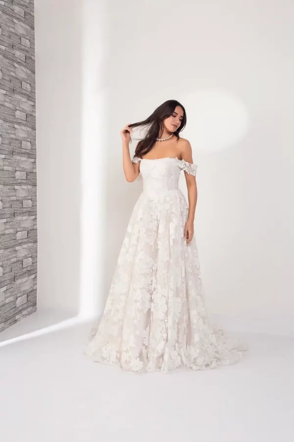 Leonie R1534 by White Rose is an off-shoulder A-line wedding dress featuring a beaded lace bodice and soft tulle skirt. Romantic, elegant, and timeless—perfect for the modern fairy-tale bride.