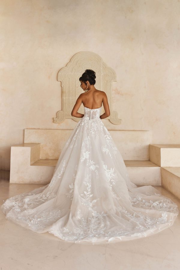 From the back, the high illusion bodice offers both support and style. A row of delicate buttons trails from the bodice down the skirt, adding a timeless touch. The illusion train adds airy volume without weight, giving the gown a dreamy finish.