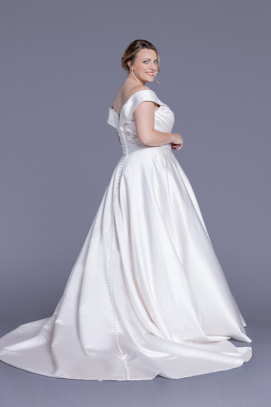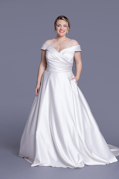 The Lorraine WP662 is a satin ballgown with a ruched sweetheart bodice and elegant off-the-shoulder straps. A timeless choice for brides seeking classic beauty and graceful style.