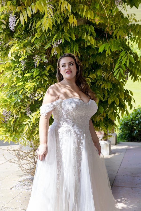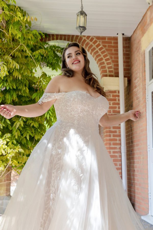 The Mia WP690 is a romantic A-line wedding dress featuring delicate off-the-shoulder sleeves, lace detailing, and a flowing tulle skirt. Designed for graceful movement and timeless charm, it’s the perfect gown for a fairytale wedding setting.