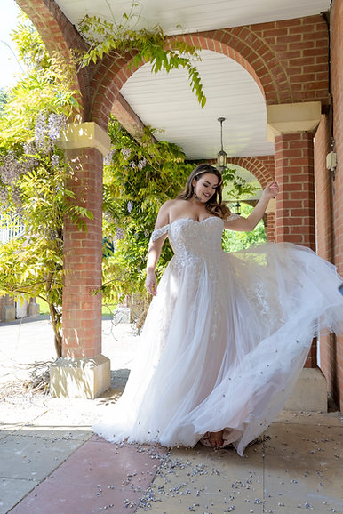 From the waist, layers of light-as-air tulle flow into a full A-line skirt. Scattered lace motifs cascade gently through the fabric, creating a sense of depth and dreamy texture. The skirt moves beautifully with every step, catching light and breeze for a truly ethereal effect. A sweep train adds just the right amount of drama without weighing you down.