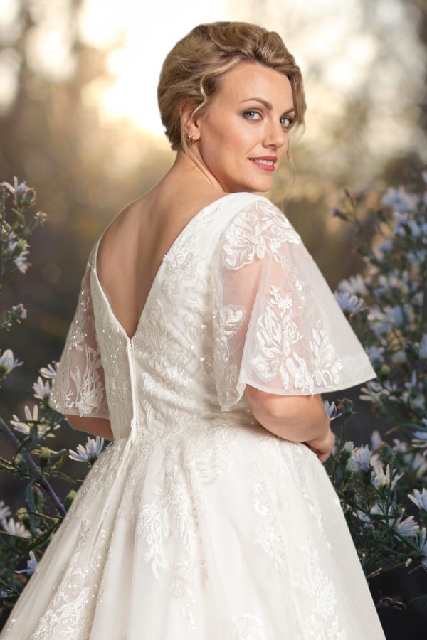 Lisa MG105 is an embroidered tulle ballgown with a flattering V-neckline and detachable flutter sleeves—romantic, lightweight, and beautifully versatile.