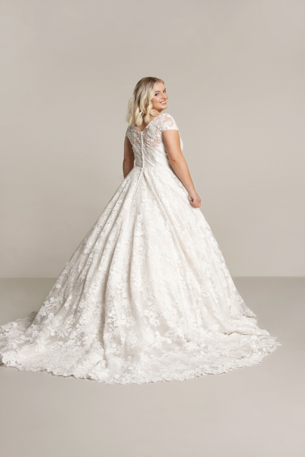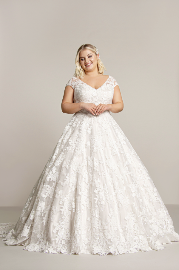 At the top, the bodice showcases a soft V-neckline that gently frames the collarbone, drawing the eye upward. Meanwhile, delicate cap sleeves add a touch of vintage grace, offering subtle coverage and a feminine finish. From here, the floral lace appliqués trail across the fitted bodice, adding beautiful texture and dimension without overpowering the silhouette.
