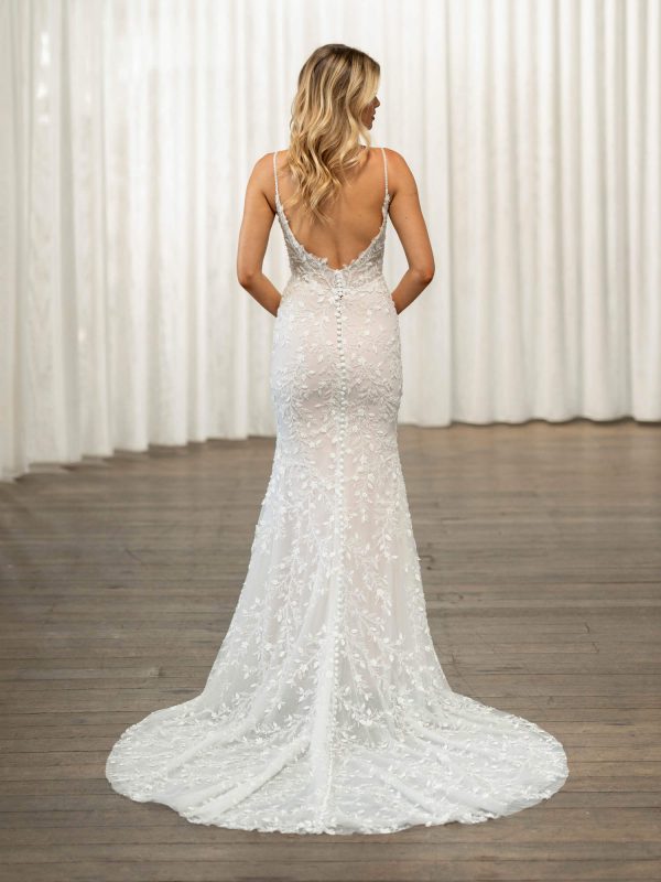 Tayce’s slim fit and flare mermaid shape contours gently to your body, accentuating your natural curves. Thoughtful lace placement enhances the figure, creating a flattering silhouette that moves effortlessly with every step. As you walk, the gown flows gracefully, adding a romantic, chic vibe to your wedding day.