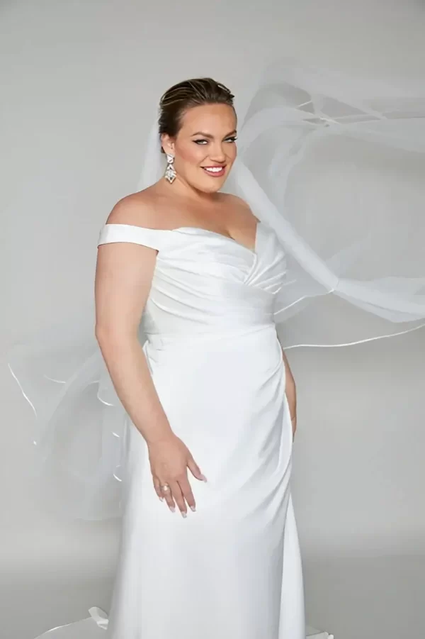 The Peta WSP001 by White Studio London is a satin A-line wedding gown with a pleated bodice, off-the-shoulder neckline, and delicate button-train detail. A perfect blend of timeless elegance and modern style for the contemporary bride.